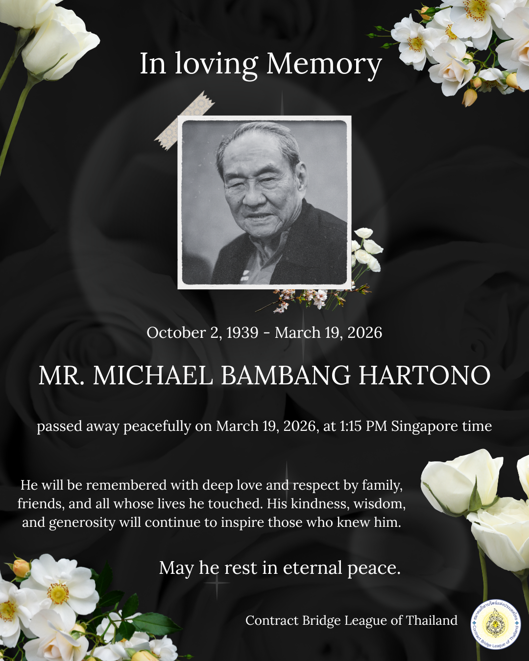 สมาคมกีฬาบริดจ์แห่งประเทศไทยขอร่วมไว้อาลัย และขอส่งกำลังใจไปยังครอบครัว ตลอดจนวงการบริดจ์ของประเทศอินโดนีเซียในช่วงเวลาแห่งความสูญเสียนี้